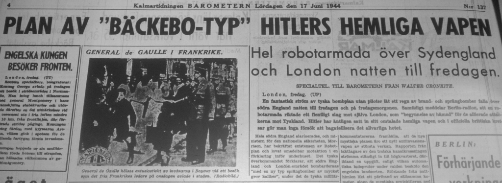 V2-raketens nedslag i Bäckebo 13 juni 1944 rapporterades i både lokalpressen och i rikspress som Dagens Nyheter med bilder på den ganska väl bevarade motordelen. Även en lekman kunde på fyra sekunder konstatera att det inte handlade om en till av de tidigare V1-haverierna på svensk mark. Chiffrerade meddelanden skickades samma dag från ambassaderna till hemländerna.