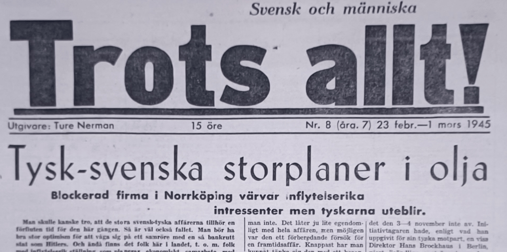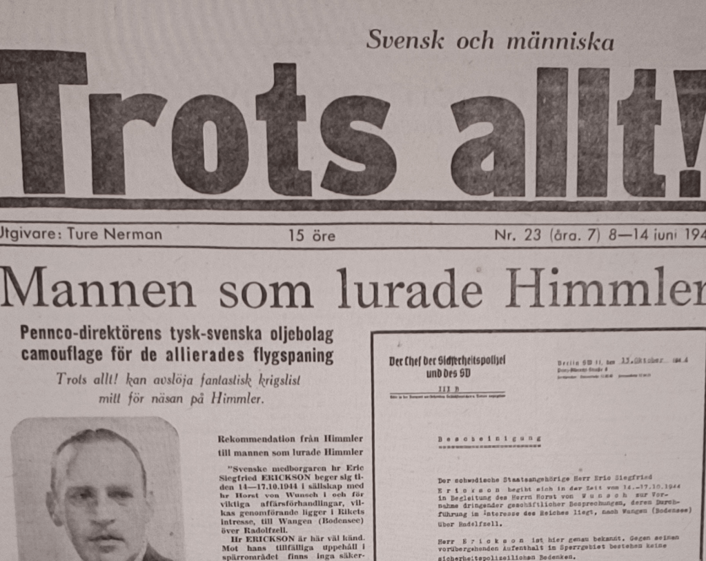 Tidningen Trots allt avslöjade projektet med det svenska raffinaderiet kort innan krigsslutet. Det kunde ha äventyrat hela spionuppdraget, men det vara bara ett par månader kvar till krigsslutet. Eric Erickson hade slutat med sina resor till Tyskland. Ett par månader senare fick ”Trots allt” dra tillbaka kritiken och istället framhäva Eric Erickson som krigshjälte. En mer nyanserad bedömning av hans insatser har fått vänta.