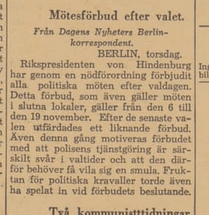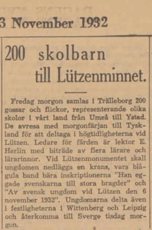 Under 1932 hölls två allmänna val i Tyskland, i juli och i november – två val som förebådade den nazistiska diktaturen och Weimar-republikens slutgiltiga fall. Valet den 6 november hölls alltså samma dag som minneshögtiden i Lützen och andra platser i Tyskland dit svenska gruppresor från militärer till skolklasser hade åkt. Händelserna rapporteras på samma sida i tidningarna men utan några som helst gemensamma intryck.