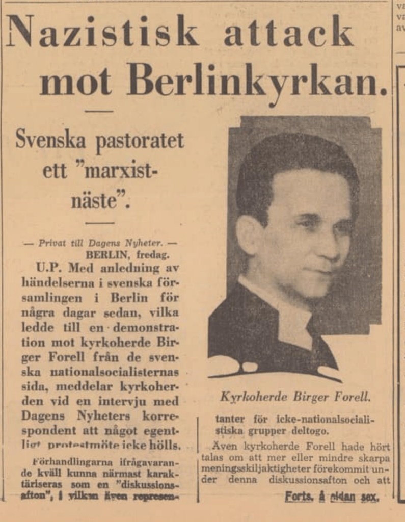 Flera av de svenska präster som var verksamma i Victoriaförsamlingen i Berlin under 30-talet och Andra Världskriget hade en inställning som liknade Bekännande kristna. Kyrkoherden Birger Forell var ledande i Victoriaförsamlingen 1929 – 1942 då han förklarades icke önskvärd mer av tyskarna. De insatser han och andra gjorde för att hjälpa utfattiga svenskar i Berlin och andra städer sågs inte med blida ögon av svenska Lindholm-nazister. Han sägs också ha hjälpt till att gömma judar och