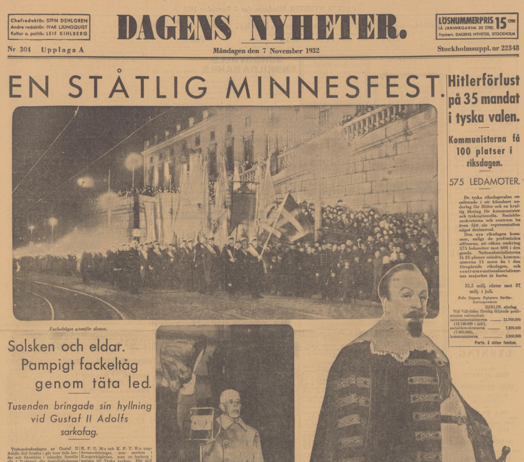 Överallt firades 300-årsdagen av Gustav II Adolf, som dog på slagfältet i novemberdimman 6 november 1632. Hela året vallfärdade militärer, skolklasser, den Lutherska kyrkans predikanter och allmänt nationalistiska element till kapellet och stenen (Schwedensteine) utanför den lilla staden Lützen strax söder om Leipzig i Sachsen. Lützenkommittén i Sverige, GustavAdolfsföreningen i Tyskland samarbetade för att fira en av Reformationens och den tyska och svenska statsbildningens främsta banérförare. Det blev kulmen på en panegyrisk historieskrivning som gått vilse i dimmorna. 6:e november 1932 var inte bara 300-årsdagen för kung Gustav II Adolfs död, det var också riksdagsval i Tyskland och en viktig etapp i Weimar-republikens dödskamp.
