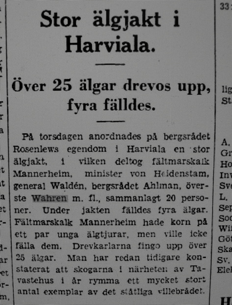 På älgjakt med Mannerheim: Medlemmarna i släkten Wahren hade efter åren kring sekelskiftet 1900 inte längre någon tillgång till stora jaktmarker då jordegendomarna i Tavastland gått förlorade. Överste (Åke?) Wahren var ändå bjuden att delta när Mannerheim och höga regeringsrepresentanter någon gån på 30-talet jagade älg på Rosenlews egendomar.