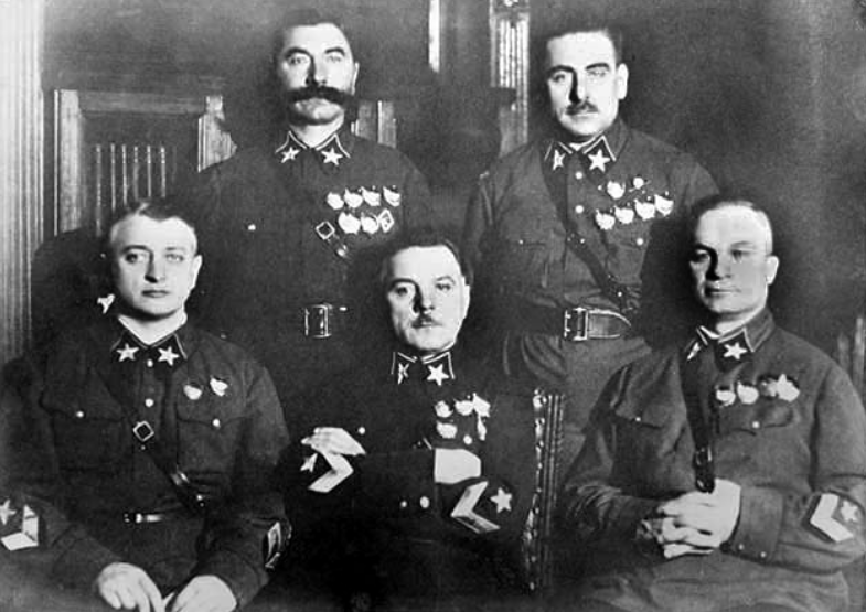Av fem marskalker avrättades tre 1937. Bara Budjonny överst tv och Vorosjilov i mitten överlevde.