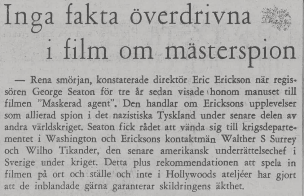 Uppmärksamheten var stor i svenska tidningar just efter kriget när den amerikanska ambassaden förklarade att han under täckmantel att vara helgjuten nazist utförde viktiga spionuppdrag. En längre intervju med Erickson presenterades i mars 1946 i Svenska Dagbladet. 1950 kom sedan översättningen av Upton Sinclairs agentbok Signal till uppbrott (1950) (Presidential mission).