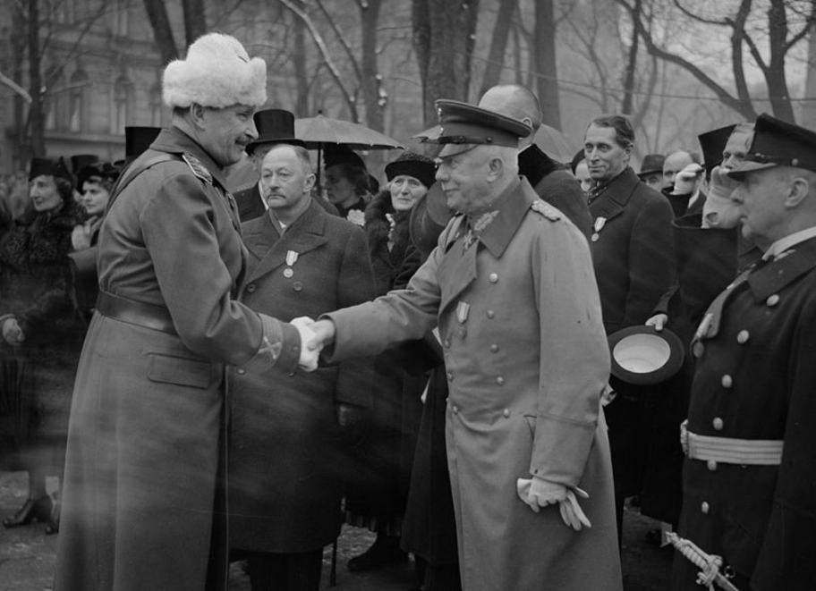 Den tyska propaganda-apparaten bearbetade tidigt att den finska statsledningen och opinionen skulle känna samhörighet med Tyskland. Här är det Mannerheim som 1938 hälsar på general Rüdiger von der Goltz, veteran från 1918 års hjälpaktion för att inta Helsingfors.