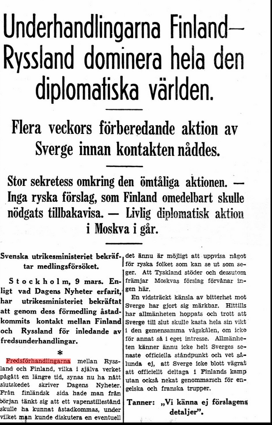 Under 1940 publiceras i utländsk press uppgifter att det är Sverige som driver på för fredsförhandlingar under vinterkriget och man antyder att det skulle vara fråga om en gemensam tysk-svensk aktion. Höga svenska officerare vill intervenera direkt och delta i kriget, men den svenska samlingsregeringen håller emot.