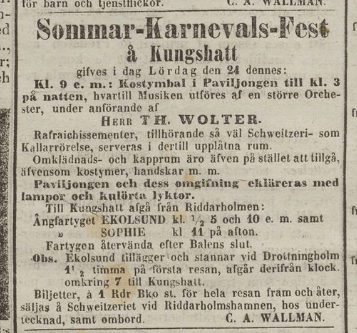 Men lustresorna kommer snart att gå också till Kungshatt –Midsommardagen 1858 är det stor fest å Kungshatt med bal i danspaviljongen till kl. 10 på aftonen. Musiken utföres av en större orkester under ledning av herr Franz Weller och på en för tillfället nära danspaviljongen arrangerad naturlig sommarteater ges av Wallins teatersällskap komedin i en akt Frontin, gift ungkarl (i översättning från franskan) Lokalerna bliva för dagens högtid lantligt dekorerade. Rafraichissementer tillhörande schweitzerioch källarrörelse serveras i därtill upplåtna rum. Biljetter kan köpas bland annat från Strindbergs kontor i riddarholmshamnen och från C.A. Wallman som nu flyttat upp till Mosebacke.