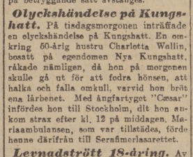 portvin, och 11,30 passerades Garnisonssjukhuset. Eldkvarn passerades 12,10 e. m. och kl. 12,25 uppsteg han vid sjöporten till Strömsborg. Vid läkarundersökning ungefär 1/2 timmes tid efter uppstigandet befanns hans puls slå 120 slag i minuten. Strax efteråt befanns den slå 106 slag i minuten. Enligt läkarens åsikt hade den vid tiden för uppstigandet ur vattnet slagit 140 slag i minuten.