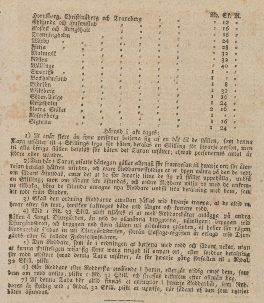 På 1700-talet företogs resor till Kungshatt med hjälp av roddbåtar, och det var redan då en organiserad färjelinje med fastställda taxor. Man kan studera en taxe-lista i Stockholmsposten 1788, vilken är svårtydbar i en del detaljer. Avgiften till Kungshatt och Rostock var 16 skilling, men var man fler än fyra i roddbåten gällde mer krångliga regler. För återresan betalades hälften, och inväntade roddaren ett dygn fick denne en viss ersättning för detta. Roddaren kunde inte neka att ta ett uppdrag om det inte fanns en skriftlig beställning och kunde bli lagförd för vägran.