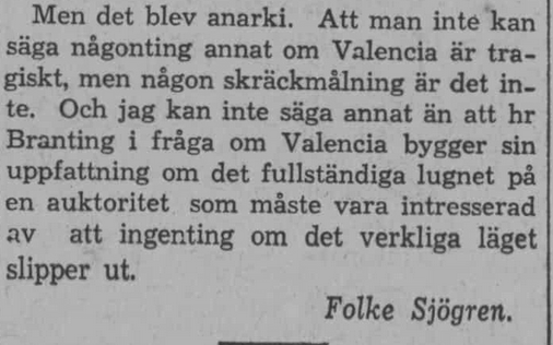 Information av det här slaget var det svårt för Spanienhjälpen att ta till sig, och i tidningen socialdemokraten avfärdade Zäta Höglund och Georg Branting det mesta som propaganda från de som stödde fascisterna. Folke Sjögren replikerade att han i det längsta hoppats på det bästa från regeringen och att det spanska folket skulle få frihet och att det skulle bli ett slut på mutsystemet och det politiska charlataneriet men…