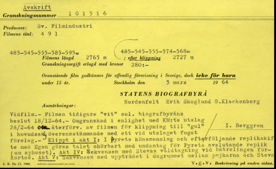 Biografbyrån ville först totalförbjuda filmen 491 från visning, men regeringen trädde in och till slut blev det en kortare nedklippning bland annat av tidelagsscenen och en flämtande hund och 18-årsgräns. Det var inte fråga om någon porrfilm utan konstnärliga stillbilder tagna av Janne Halldof. Däremot blev filmen en hård kritik mot samhällets kriminalpolitik, en käftsmäll mot bristerna i det svenska folkhemmet.