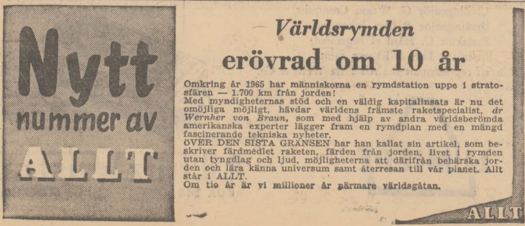 Däremot blev det snabbt ett militärt intresse att utveckla ”lufttorpeder” eller missiler och robotar, medan de utopiska idéerna om rymdfärder och satelliter frodades inom science fiction-magasin och UFO-föreningar. En mer seriös förening i sammanhanget var det Svenska Interplanetariska Sällskapet.