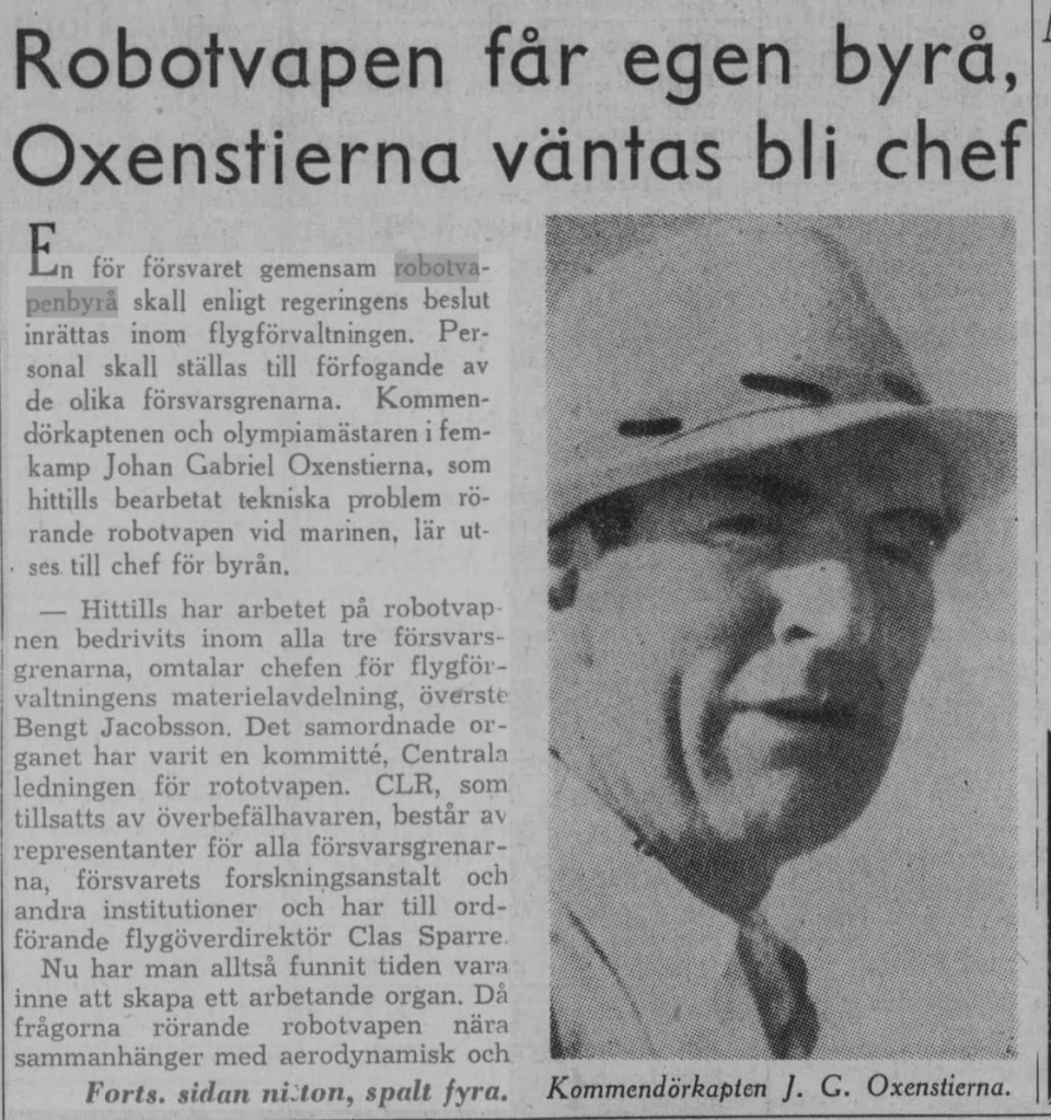 Johan Gabriel Oxenstierna var den förste chefen för det sammanslagna försvarets robotvapenbyrå för alla vapenslagen efter att den bildades den 1 april 1948. Själv kom han från Marinförvaltningens torpedbyrå. Oxenstierna hade tidigare besökt SAAB i slutet av 1946 för att diskutera konstruktion av en styrautomat till lufttorpeder, och han hade då med sig en styrautomat från en V1:a som han tagit hem från England. Oxenstierna betraktas som en grundande personlighet för den svenska försvarsmaktens robotvapenverksamhet.