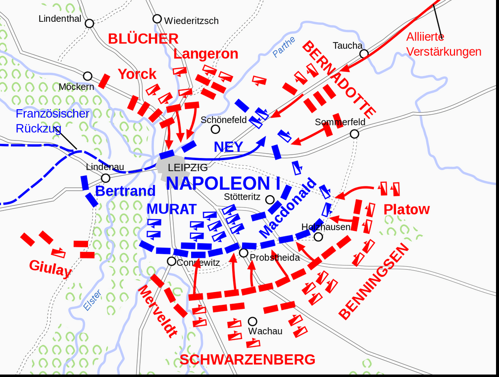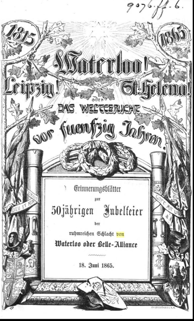 I en minnesskrift 50 år efter Napoleons fall framhålls att slaget vid Leipzig 1813, som var det blodigaste under hela Napoleonkrigen, också var det största som enade alliansen mellan alla stater som var emot Napoleon. Ytterligare en gång används slagfältet i Breitenfeld, nu i en av de hårdaste uppgörelserna, kanske mer avgörande än Waterloo, som bara bekräftar att Napoleon och Frankrike har förlorat. Hela Leipzig var omringat och Napoleons reträttväg gick åt nordost förbi Wahren.